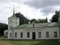 Служби (1830—1840-ві роки) розташовані на парадному дворі садиби. Дві будівлі служб ідентичні за своїми архітектурними формами. Споруди в стилі пізнього класицизму, основні об'єми з цегли, мезоніни — дерев'яні, прямокутні в плані, тиньковані. Центральна частина головного фасаду акцентована величезною напівциркульною нішею, в яку вписаний портик тосканського ордера 1-го поверху, що підтримує балкон мезоніну з балюстрадою. Скульптури сплячих левів встановлені з боків головних входів. Споруди включені в композицію парадного двору ансамблю.