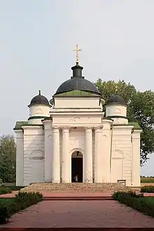 Георгіївська церква (1817–1828) споруджена в стилі ампір, з цегли, потинькована і побілена. У плані хрестоподібна з видовженим західним раменом і дзвіницею, що примикає до неї, з напівкруглою апсидою і кутовими прямокутними в плані камерами, рівними по висоті основному об'єму. Західний вхід акцентований 4-колонним доричним портиком (колони подвоєні), зверху антаблемент з тригліфами по фризу.