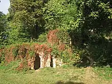 Під альтанкою в товщі пагорба міститься підвал із склепінням, з декоративними нішами і внутрішньостінними сходами. Підвал має 4 дверні отвори (3 з них закладені). Перед входами — трапецієподібні майданчики, обмежені підпірними стінами, спорудженими по зрізу пагорба. Вікна та двері мають стрілчасту форму. Фасади прикрашені медальйонами, розписаними за сюжетами опери «Руслан і Людмила». Покриття підлоги — металева плитка.