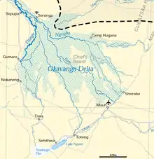 Болото і озеро є залишками колишнього значно більшого озера Макгадікгаді, що займало западини північного Калахарі близько 12000 років тому. Озеро Нгамі, як і болота дельти, живиться річкою Окаванго, стік якої зазнає значних сезонних коливань, внаслідок чого площа озера і його берегова лінія постійно змінюється. Озеро було відкрито в 1849 році Девідом Лівінгстоном, за оцінками якого воно тоді було приблизно 32 км завширшки і 128 км завдовжки і мало окружність близько 275 км; однак до 1950 року майже вся озерна западина стала рівниною зарослою травою, а під час посухи 1965/66 років озеро висохло повністю. Через те, що озеро є джерелом води для десятків тисяч голів худоби, що належали довколишнім жителям, пересихання озера поставило їх на грань виживання. Під час наступного порівняно дощовитого періоду озеро знову почало наповнюватись, але зараз воно все одно значно менше, ніж за часів, коли його вперше побачив Лівінгстон. На озері і в околицях зустрічається велике різноманіття птахів, особливо під час повеней; риби, що живуть в озері, здатні проводити тривалий час закопаними в мул, пережидаючи посушливий сезон, коли озеро пересихає.