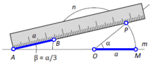 Продовжимо сторону OM початкового кута і побудуємо на ній як на діаметрі коло довільного радіуса a з центром у точці O. Сторони кута перетинаються з колом у точках P і M. Візьмемо лінійку невсіса, відклавши на ній діастему a, і використовуючи пряму OM як напрямну, точку P як полюс, а півколо як цільову лінію, будуємо відрізок AB. Отримаємо кут BAM, що дорівнює одній третині початкового кута α.