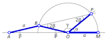 Трикутник BPO також рівнобедрений, кути при його основі рівні 2β, а кут при вершині γ = 180 ° -4β. З іншого боку, γ = 180 ° -β-α. Отже, 180 ° -4β = 180 ° -β-α і α = 3β.