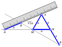 Візьмемо рівносторонній трикутник MPN зі стороною a, продовжимо сторону PN і на відстані a від точки N побудуємо точку R (рис. 6). Продовжимо вліво відрізки NM і RM. Візьмемо лінійку невсіса з діастемою a і використовуючи пряму NM в як напрямну, точку P як полюс і пряму RM яко цільову лінію, отримаємо відрізок AB. Довжина відрізка BP відповідає стороні куба подвоєного об'єму, порівняно з кубом зі стороною a (тобто дорівнює кубічному кореню з 2 помноженому на a).