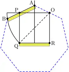 Побудуємо квадрат PQRO зі стороною a (рис. 5). Проведемо дугу кола з центром O і радіусом OQ. Візьмемо лінійку невсіса з діастемою (довжиною) a і використовуючи вертикальну вісь симетрії квадрата як напрямну, точку P як полюс і дугу кола як цільову лінію, отримаємо відрізок AB, який буде стороною правильного семикутника, з вертикальною віссю симетрії, що збігається з віссю симетрії квадрата.