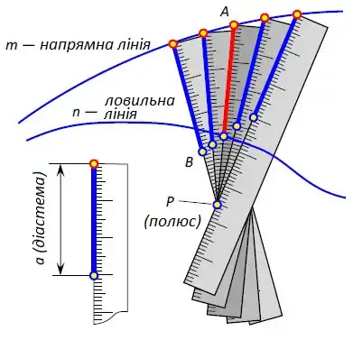 Притискаючи лінійку до шпильки, починаємо рухати точку А по кривій m так, щоб точка B наближалася до кривої n.