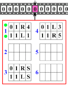 - Можна уявити, що в разі неоднозначності переходу (поточна комбінація стану і символу на стрічці допускає кілька переходів) НМТ ділиться на кілька НМТ, кожна з яких діє за одним з можливих переходів.