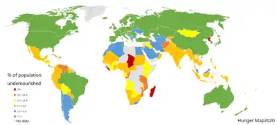 Пробема недоїдання й загалом голоду дуже актуальна для багатьох країн Африки, особливо для Сахельського регіону[6], для Сомалі[7] й Еритреї, де спостерігається найсильніша за останні 60 років посуха. За останніми повідомленнями значно погіршилася ситуація з забезпеченням населення продовольством у Ємені[8].