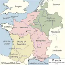 У VI–VII століттях Нейстрія неодноразово відокремлювалася в самостійне королівство, як і північно-східна область королівства, Австразія. Була остаточно об'єднана з Австразією після перемоги австразійського мажордома Піпіна Геристальского в битві під Тертрі у 687 році.