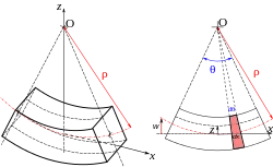 Виділимо елемент балки двома суміжними поперечними перерізами, що розташовані один від одного на відстані dx, та взявши до уваги гіпотезу плоских перерізів, розглянемо його деформований стан. Згадані перерізи повертаються один відносно одного на кут dθ, залишаючись при цьому пласкими. Елемент нейтрального шару між перерізами перетворюється на дугу з радіусом ρ, а волокно, розташоване на відстані z від нейтрального шару — на криволінійне волокно радіусом кривини ρ + z. Відносне видовження цього волокна з врахуванням, що dx=ρdφ: