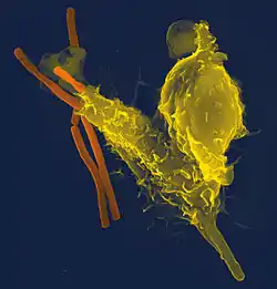 ![]() Нейтрофіл, який поглинає бактерію — збудника сибірки | |