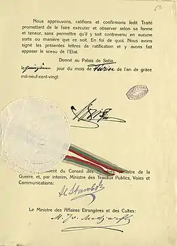 - О. С. Пархомчук. Нейїський мирний договір 1919 // Українська дипломатична енциклопедія: У 2-х т./Редкол.:Л. В. Губерський (голова) та ін. — К.:Знання України, 2004 — Т.2 — 812с. ISBN 966-316-045-4