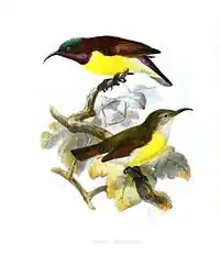 | Certhia zeylonica Linnaeus, 1766 Arachnechthra zeylonica (Linnaeus, 1766) Chalcostetha zeylonica (Linnaeus, 1766) Cinnyris sola Vieillot, 1819 Cyrtostomus zeylonicus (Linnaeus, 1766) Nectarinia zeylonica (Linnaeus, 1766) | ||||||||||||||||