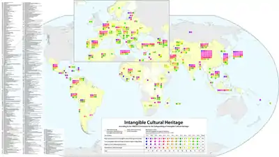 Для забезпечення більшої наочності нематеріальної культурної спадщини, сприяння поглибленню усвідомлення її значення та заохочення діалогу на основі поваги до культурного різноманіття складається, оновлюється та публікується Репрезентативний список нематеріальної культурної спадщини людства (англ. Lists of Intangible Cultural Heritage) та Реєстр належних практик захисту (англ. Register of good safeguarding practices). На кінець 2019 року до списку включено 549 елементів нематеріальної культурної спадщини 127 країн.[4]