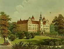 Резиденція будувалася поетапно (1573—1577, 1589—1592, 1610), а її фундаторами була родина Пуклерів, а пізніше (з XVII століття) — Промніців. Чотирикрила споруда розташовувалася навколо прямокутного двору, оточеного аркадами. Після 1787 року, з ініціативи нового власника, графа Яна II Непомука фон Прашма, було змінено дизайн інтер'єрів замку, зроблено численні зміни на окремих поверхах будівлі. У ХІХ столітті було замуровано аркади первісних клуатрів та перебудовано каплицю.
