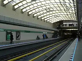Крита наземна станція з двома прямими береговими платформами. Станція з колійним розвитком — перехресний з'їзд в кінці лінії.