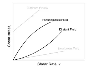 - Степенева рідина — нелінійна, закон степеневий (n ≠ 1): ::