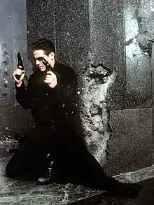 На неймовірній швидкості він проноситься по місту і встигає зловити Триніті, коли вона падає з вікна хмарочоса. Агент встиг її смертельно поранити, але Нео, використовуючи свою силу, повертає її до життя.