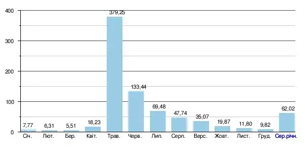 За період спостереження, абсолютний мінімальний місячний стік (абсолютний мінімум) був 1,37 м³/с (у межень квітня 1969 року), абсолютний максимальний місячний стік (абсолютний максимум) становив 577 м³/с (у травні 1983 року).