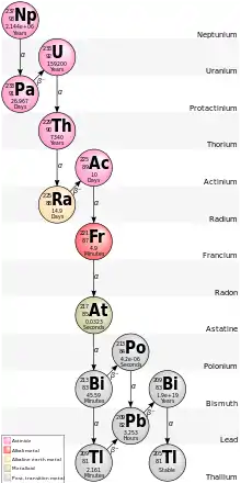 Нептуній — хімічний елемент з атомним номером 93, актиноїд, перший трансурановий елемент. Названий на честь планети Нептун. Позначається символом Np. Усі ізотопи нептунію радіоактивні, тому він практично не зустрічається в природі. Штучний нептуній утворюється як побічний продукт при роботі ядерних реакторів. Щороку виробляється близько п'яти тонн нептунію.[4]Нептуній був уперше отриманий Е. М. Макмілланом і Ф. Г. Абельсоном у 1940 році у процесі обстрілювання урану нейтронами.