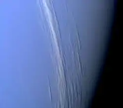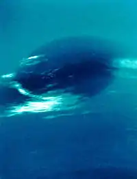 ![]() Нептун, сфотографований «Вояджером-2» з Великою темною плямою ліворуч і Малою темною плямою праворуч унизу. Білі хмари складаються з метанового льоду. | |||||||||||||
