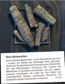 - Buchner E., Schmieder M. (2017). Possible traces of the impactor on fracture surfaces of shattered belemnites from the Nördlinger Ries crater (Southern Germany) and potential consequences for the classification of the Ries impactor. Zeitschrift der Deutschen Gesellschaft für Geowissenschaften 168 (2): 245–262. doi:10.1127/zdgg/2017/0090.