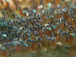 Ікра риб-клоунів. Видно очі личинок (чорні цятки).