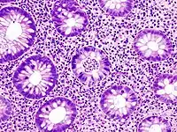 ![]() Ендоскопічна картина ураженої неспецифічним виразковим колітом секції сигмовидної кишки. Внутрішня поверня кишки покрита плямами та звиразкована. Ендоскопічна картина ураженої неспецифічним виразковим колітом секції сигмовидної кишки. Внутрішня поверня кишки покрита плямами та звиразкована. | |