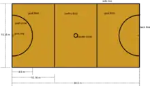 Майданчик для гри розміром 15,25 м на 30,5 м (50 на 100 футів) розділено на три окремі зони (або «третини»). Обома боками майданчику знаходяться напівкруглі зони — площі воріт (shooting circles) радіусом 4,9 м (16 футів).