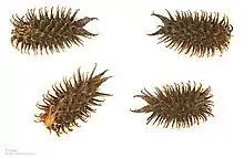Плоди довгасті, округлі, колючі, чіпкі сім'янки — реп'яхи до 1—2 см в діаметрі. супліддя зелені або сірувато-зелені.