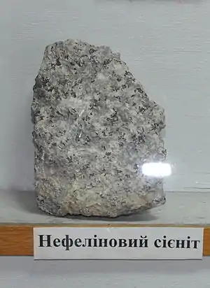 Нефеліновий сієніт (рос. нефелиновый сиенит, англ. nepheline-syenite, нім. Nephelinsyenit m) — повнокристалічна магматична лужна гірська порода, що складається з лужного польового шпату (65-70%), нефеліну, рідко ін. фельдшпатоїду (бл. 20%) і невеликої кількості (10-15%) кольорових мінералів — біотиту, лужного піроксену і амфіболу. Іноді містить плагіоклаз. За набором мінералів і структурою виділяють велике число різновидів Н.с.