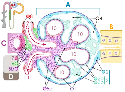 А — Ниркове тільце В — Проксимальний каналець С — Дистальний звивистий каналець D — Юкстагломерулярний апарат 1. Базальна мембрана 2. Капсула Шумлянського-Боумена — парієтальна пластинка 3. Капсула Шумлянського-Боумена — вісцеральна пластинка 3a. Події (ніжки) подоцита 3b. Подоцит 4. Прострір Шумлянського-Боумена |