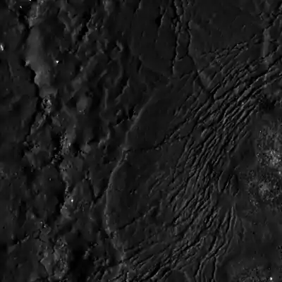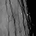 Терасоподібна структура у західній частині внутрішнього схилу кратера. Знімок Lunar Reconnaissance Orbiter. Ширина знімку близько 660 м
