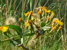 Багаторічна рослина висотою 70–150 см. Стебло товсте, міцне, нерідко з жорсткими волосками. Листки злегка блакитно-зелені, знизу з неясним сітчастим жилкуванням. Стеблові листки численні, сизі, яйцеподібні або ланцетні. Квітконоси іноді розсіяно зірчасто запушені. Загальне суцвіття зонтикоподібне або зонтикоподібно-волотисте, з 4–50 кошиками[2]. Кореневища товсті. Квіточки жовті. Сімянки чорно-коричневі, циліндричні, ≈ 3 мм, з 10 ребрами. Папус блідо-жовтий, ≈ 6 мм. 2n = 27, 36[3].