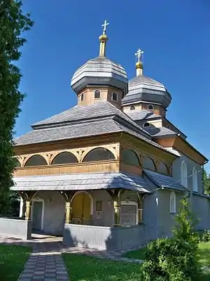 - Цегляна архаїчна оборонного типу Троїцька церква (XVI ст.) з дерев'яною аркадою-галереєю й восьмигранними куполами під ґонтом.