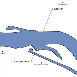 Станція Нижній Новгород розташована на березі річки Волга біля автовокзалу. Звідти лінія перетинає Гребний канал по берегах якого стоять дві опори. Звідти лінія підіймається до першої з двох колони висотою 82 м, яка розташована на чотирьох великих бетонних фундаментах на часто затопленому острові. Звідти лінія має прогін завдовжки 900 м над водним дзеркалом до другої високої колони на іншому березі. Далі лінія прямує правобережними річковими луками шириною приблизно 1,6 км до станції Бор.