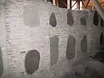 Будівля складена з цегли в рівношаровій техніці. Формат цегли 3.5-4 х 15 х 25-26.5 см. Зустрічаються також лекальні цеглини. На торцях цегли зрідка трапляються опуклі знаки. В кладку стін зовні будівлі введені декоративні елементи: великі шліфовані кам'яні вставки різного кольору (граніт і гнейс), що мають в поперечнику до 1.4 м. Вище в стіни були вкладені також керамічні плитки і круглі тарелі.