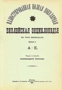 Головною працею архімандрита Никифора є Ілюстрована повна популярна Біблійна Енциклопедія, написана ним у 1890—1891 роках. Згідно з передмовою, Никифор мав ціль дати відповіді: «майже на більшу частину питань біблійної археології, архітектури, астрономії, географії, біографії біблійних діячів, ботаніки, священної бібліографії, воєнної науки, зоології, землеробства, мистецтв, мінералогії, метеорології, медицини, математики, нумізматики, педагогіки, фізики, етнографії та ін.». Складена ним енциклопедія включає близько 7500 роз'яснень різних понять з книг Старого і Нового Заповітів.