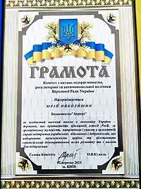 - 2014 — Грамота Верховної Ради України;