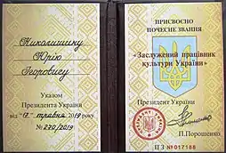 - 2019 — звання «Заслужений працівник культури України».