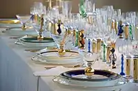До 90-річчя Нобелівської премії було розроблено спеціальні сервізи, які використовуються на Нобелівських бенкетах. Столову порцеляну розробив видатний шведський гончар і дизайнер Карін Бьоркіст, а питне скло та столові прилади створив шведський ювелір, художник по склу, промисловий дизайнер Гуннар Сайрен. Важливий елемент сервірування — столовий текстиль розробила Інгрід Дессау.