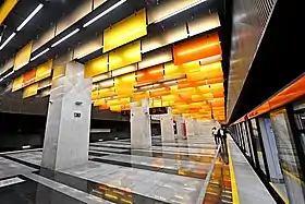 У прямокутному обсязі платформної ділянки пластика створюється в основному дизайном стелі. Стеля на станції підвісна, виконана з різноформатних панелей з триплексу з кольоровою плівкою оранжевого кольору 3 відтінків. Між панелей розташовуються лінійні групи освітлювального обладнання трубки світлодіодного освітлення. Залізобетонне перекриття стелі пофарбовано темно-сірою силікатною фарбою, тому структура стелі контрастує з перекриттям. Підвісна система стелі разом з розташованими в ній світильниками створює ефектну гру з безліччю відтінків кольорів, що накладаються один на одного в перспективі, і світлових ефектів.
