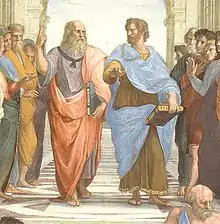 1508 року за дорученням папи Юлія II Рафаель розписує станці (парадні зали) Ватиканського палацу. Станца делла Сеньятура була першою з розписаних Рафаелем (1508–1511). Його фрески — це алегоричні зображення людської діяльності: «Афінська школа» — філософія, «Диспут» — богослів'я, «Мудрість, помірність та сила» — правосуддя, «Парнас» — поезія. У своїх чотирьох великих композиціях Рафаель показав чотири основи, на які, на його переконання, має спиратися людське суспільство: розум (філософія, наука), доброта та любов (релігія), краса (мистецтво), справедливість (правосуддя). Зображений на фресці Арістотель тримає в руках свою етику і вказує жестом на етичну організацію світу. Натомість Платон тримає в руках діалог «Тімей», його жест, що вказує угору, має символізувати рух чуттєвого світу до світу ідей.