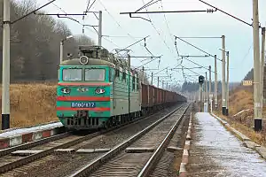 ![]() Вантажний поїзд проїжджає повз зупинний пункт. | |