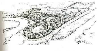 Січ являла собою місто — фортецю оточену валом та палісадами. Підпільненська Січ складалася з трьох частин: передмістя, або так званого крамного базару, де всі курені та приїжджі гості мали свої крами та шинки для торгівлі де були житла базарних отаманів та військового кантаржія або хранителя ваг і мір. Це передмістя називалося Гассан — Башею. Від нього починалася брама, що вела до Коша — головного укріплення, де довкола січового майдану розташовувались 38 куренів. Курені були просторими казармами. Між куренями затокою Уступ та річкою Підпільною розмістився Внутрішнй Кіш або Паланка відділений стіною від Зовнішнього Коша. На Паланці знаходились будинки кошового отамана та січової старшини, а також соборна Січова церква Покрови Божої Матері, військова канцелярія, скарбниця та будинки духовенства.