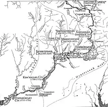 З трьох боків Січ оточувалась притокою Дніпра річкою Підпільною, якою плавали запорізькі чайки та торгові турецькі й грецькі судна (тумбаси), що припливали до січової гавані в річковій затоці Уступ. З північно — східного боку від Підпільної відокремлювався рукав — річка Сисина, що впадала в Дніпро.