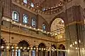 Вікна прикрашені кольоровими вітражами. На всіх вікнах є аяти і сури з Корану. Мечеть оброблена фаянсом і має п'ять воріт, одні з яких виходять на передній двір мечеті.