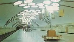 Форму склепіння продовжують стіни, оздоблені мармуром світлих тонів з декоративною різьбою у вигляді сталактитів, що оперізують колійні стіни платформового залу. Світильники у вигляді шестигранних стільників, утоплені у склепіння, створюють малюнок що світиться на стелі.