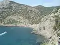 - Синя бухта, інша назва — Розбійнича. В старовину, ще з часів таврів і елінів, тут ховались судна піратів. Це глибока бухта з маленьким пляжем, на якому купаються хіба що екскурсанти, що втомились на прогулянці по стежці Голіцина. Є симпатичний пляж на виході з бухти, але туди ще потрібно зуміти добратись.