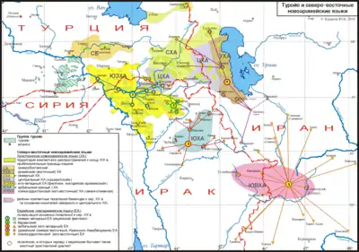 - мова туройо і близький до нього діалект млахсо — на південному сході Туреччини (гірський район Тур-Абдин у провінції Мардін), на яких говорять близько 70 тис. людей (більша частина носіїв живе за межами Тур-Абдіні, як у країнах Близького Сходу, так і в країнах Європи і Америки);