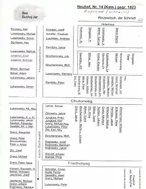 Першими переселенцями, що заснували село, були: Arndt, Birschemisky / Pirscheminsky, Bittner, Erdmann, Grenz, Jaschinski (Josef, из Westpreussen — Danzig, 1823), Kleinschmidt, Kossakowsky, Kruschinsky, Lukanowsky, Pernitzky (Martin, из Westpreussen — Danzig, 1823, в Neuhof), Roglowsky, Saretzki, Sawatzky, Schirkowskij / Schirkowsky, Wanscheid, Witkowski / Wittkowsky, Zizz.[6]